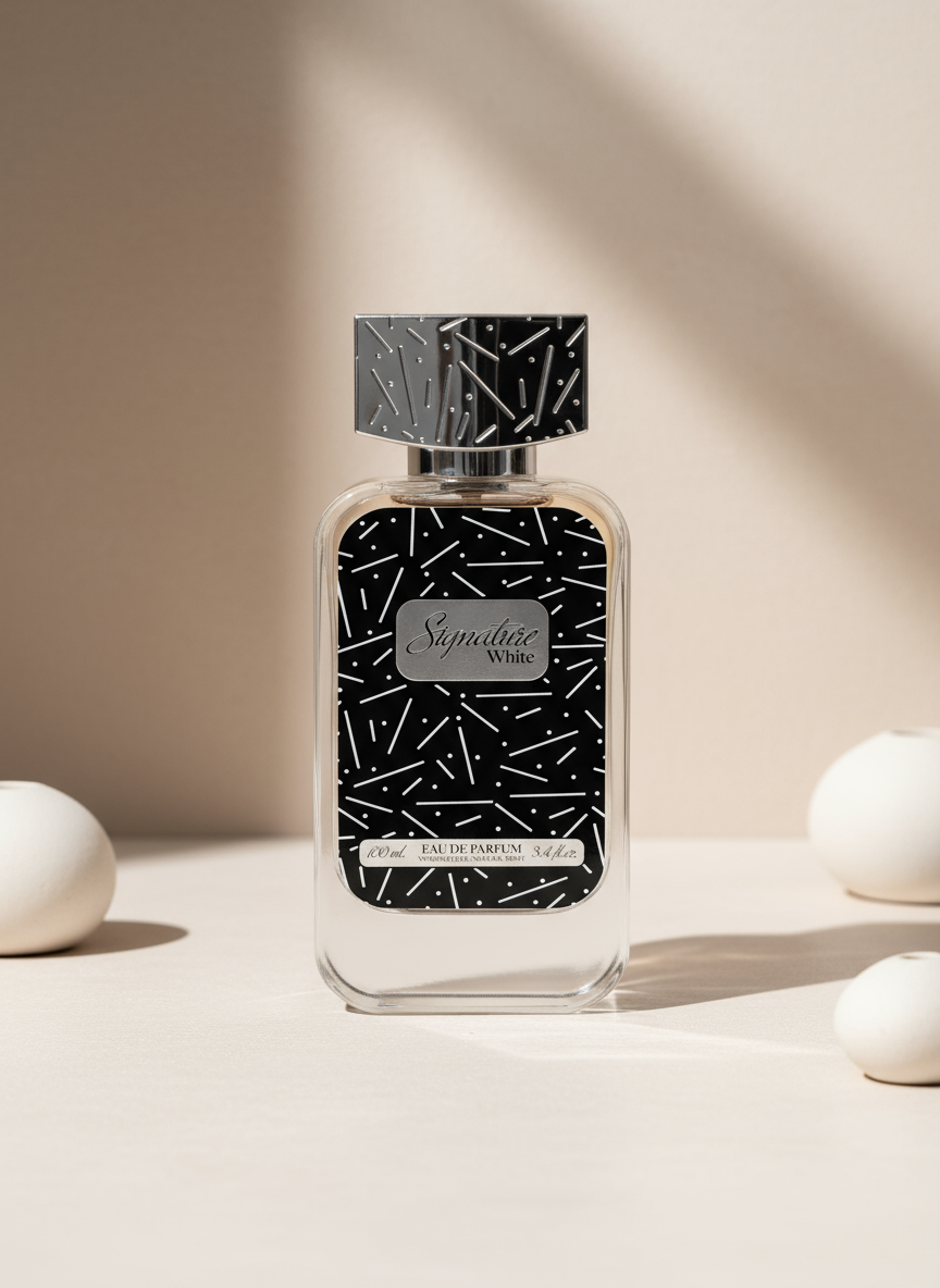 Signature White Dkhoon Emirates عطر شرقي - زهري للجنسين. Signature White صدر عام 2022. Olaf Larsen قام بتوقيع هذا العطر. إفتتاحية العطر الأناناس, الباتشولي, الهيل و الكاراميل; قلب العطر الياسمين, الورد و السوسن; قاعدة العطر تتكون من خشب الصندل, حبوب التونكا, الفانيليا و المسك.