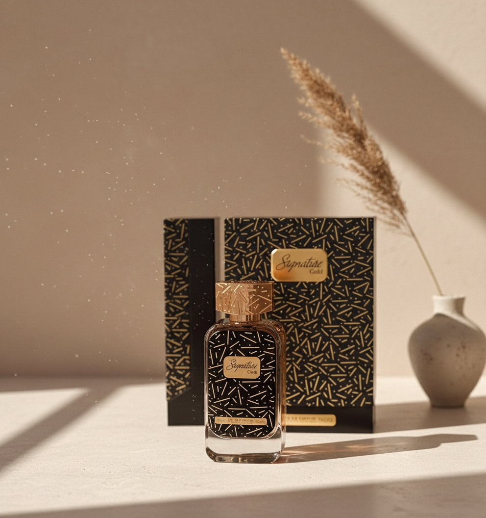 Signature Gold Dkhoon Emirates عطر شرقي للجنسين. Signature Gold صدر عام 2021. Tameem Bin Hezam قام بتوقيع هذا العطر. إفتتاحية العطر العسل و الزهور البيضاء; قلب العطر الكاراميل; قاعدة العطر من الباتشولي.