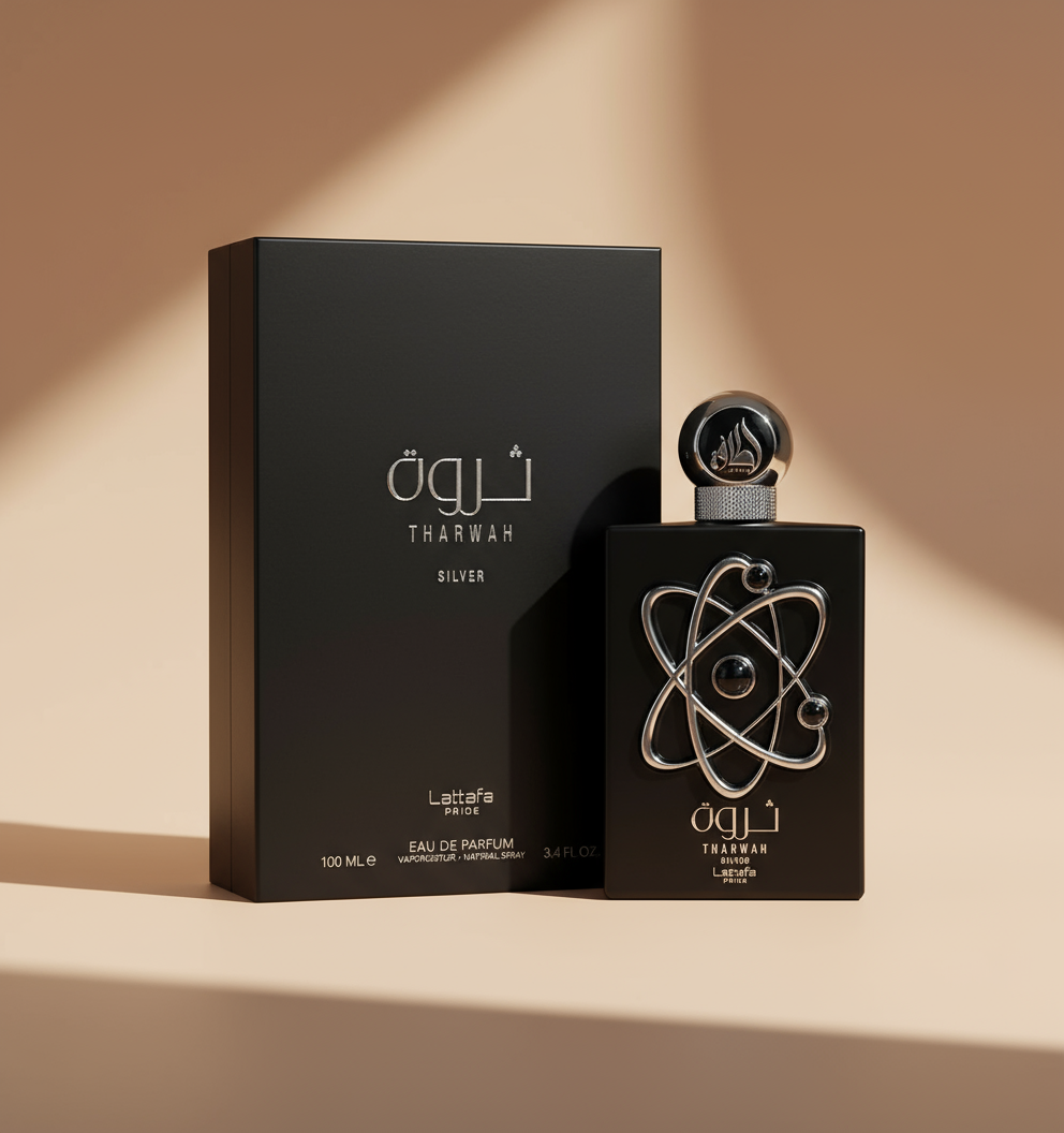 Tharwah Silver Lattafa Perfumes عطر خشبي - مائي للرجال . هذا عطر جديد Tharwah Silver صدر عام 2022. إفتتاحية العطر النعناع و البرغموت; قلب العطر المريمية و الخزامي; قاعدة العطر تتكون من المسك, نجيل الهند و خشب الأرز.