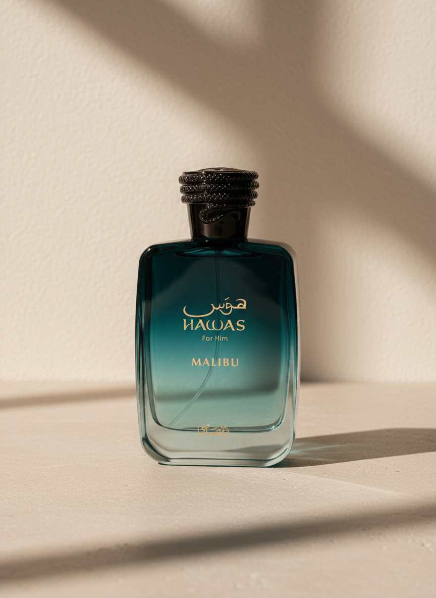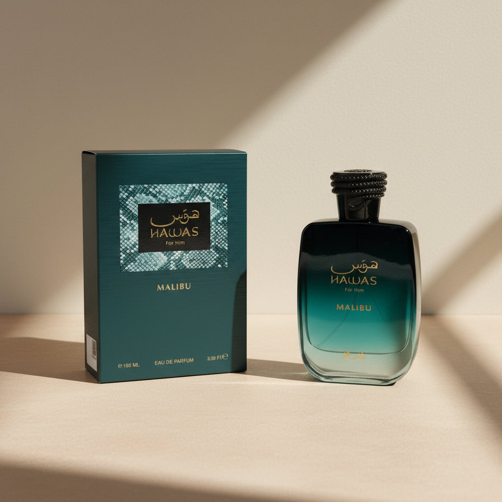 Hawas Malibu Rasasi عطر أروماتك للجنسين. هذا عطر جديد Hawas Malibu صدر عام 2025. إفتتاحية العطر الأناناس, البرتقال و الجريب فروت; قلب العطر السوسن, العنبر و الخزامي; قاعدة العطر تتكون من حبوب التونكا, المسك, الباتشولي و أخشاب الكشمير.