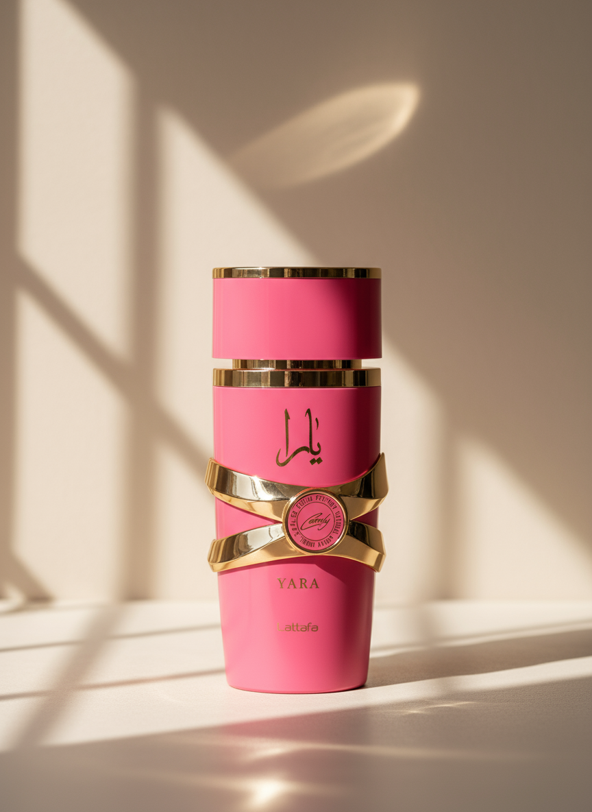 Yara Candy Lattafa Perfumes عطر زهري - فواكه - جورماند للنساء . هذا عطر جديد Yara Candy صدر عام 2024. إفتتاحية العطر الكشمش الأسود و الماندرين الأحضر; قلب العطر Strawberry Fizz Candy و الغاردينيا; قاعدة العطر تتكون من الفانيليا, المسك, العنبر و خشب الصندل.