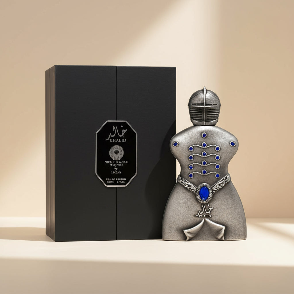 Niche Emarati Khalid by Lattafa Perfumes هو عطر للنساء والرجال. تم إطلاق Niche Emarati Khalid في عام 2023. المكونات العليا هي الجلد واللبدانوم والزعفران؛ النغمات الوسطى هي البتولا وزيت كايد والباتشولي؛ المكونات الأساسية هي الجلد والعود وبلسم تولو والبنزوين.